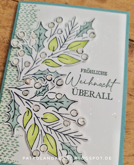 Diese Karte ist mit einem dem neuen Produktpaket "Fröhliche Festtage" entstanden. Und auch wenn es nicht so aussieht, ist die Karte recht schnell entstanden. Im Set befindet sich der Stempel für die "Kantenstempelung", die ich dann noch mit der Wischtechnik eingefärbt habe.